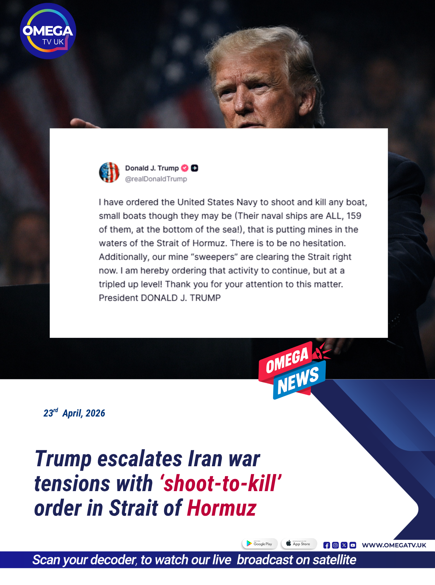 Tensions in the Middle East have escalated sharply after former U.S. President Donald Trump announced he has ordered the U.S. Navy to “shoot and kill” any boat suspected of laying mines in the Strait of Hormuz.